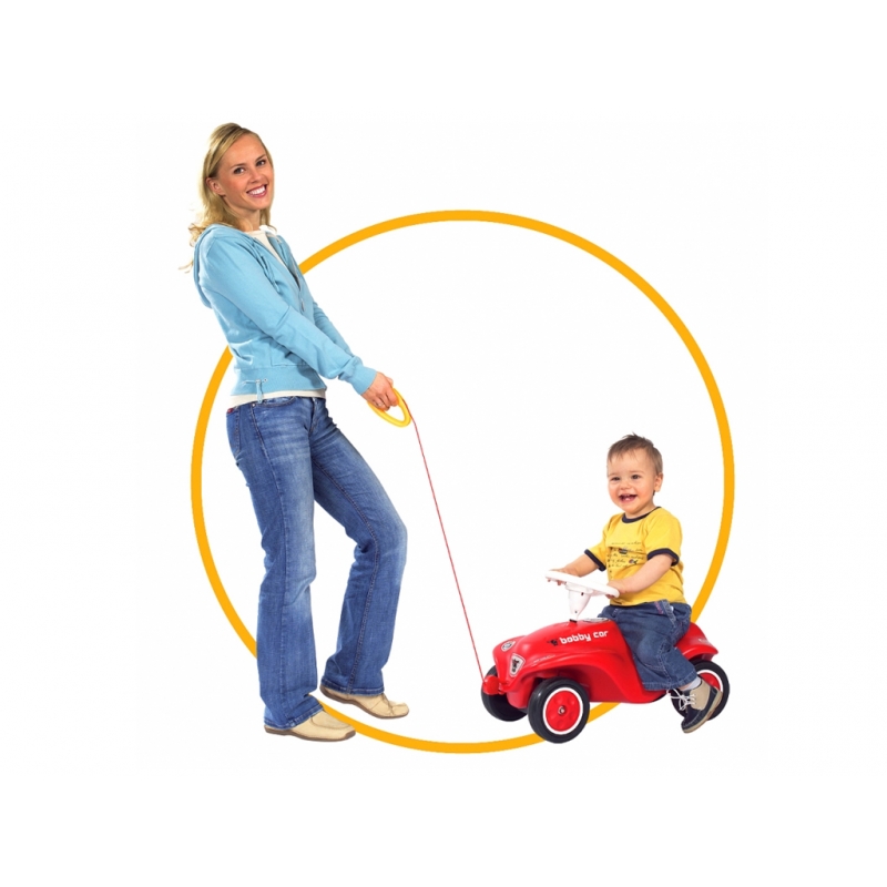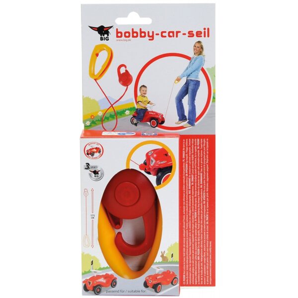 BIG Czerwona Lina holownicza z żółtym uchwytem pasuje do wszystkich pojazdów BIG Bobby Car wyposażonych w uchwyt holowniczy. Łatwo się także mieści w kieszeni, gdy nie jest używana.