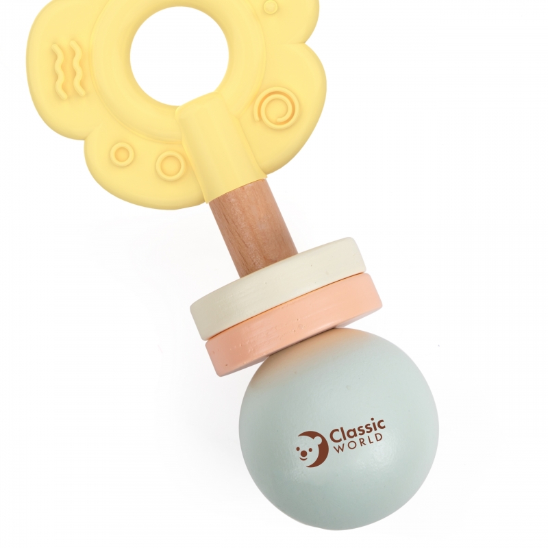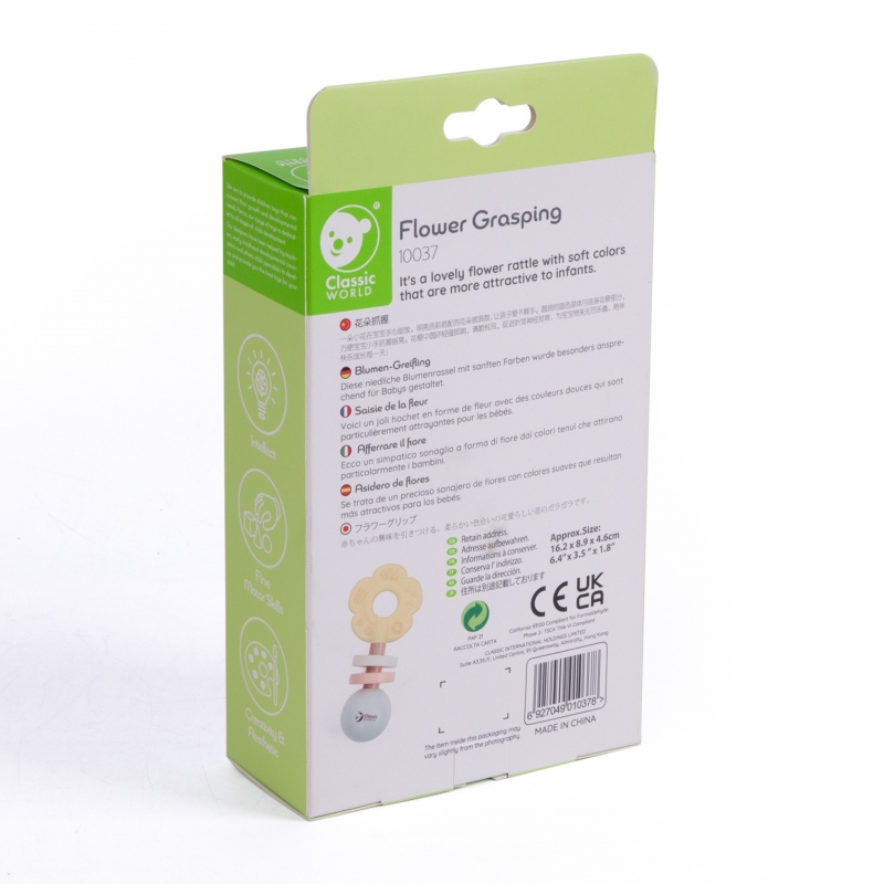 Urocza grzechotka w kształcie kwiatka zaprojektowana została z myślą o najmłodszych dzieciach. Delikatne, pastelowe kolory przyciągają uwagę maluszka, a przyjemna w dotyku powierzchnia i odpowiedni rozmiar sprawiają, że łatwo ją chwycić i potrząsać. Zabawka została stworzona z bezpiecznych materiałów – drewna i silikonu – dzięki czemu nadaje się dla dzieci już od pierwszych dni życia.