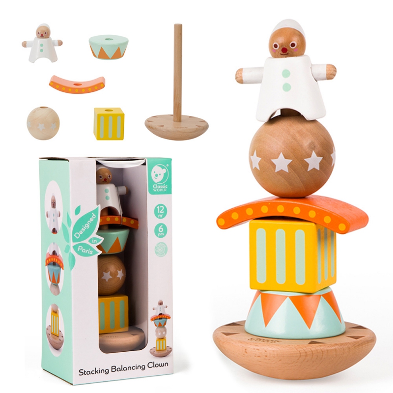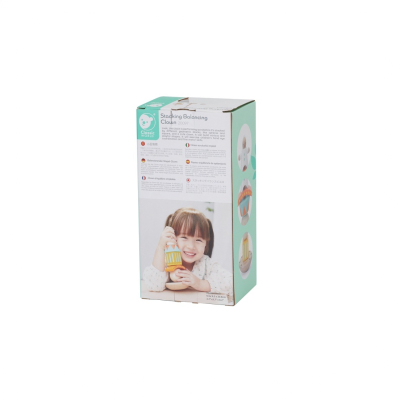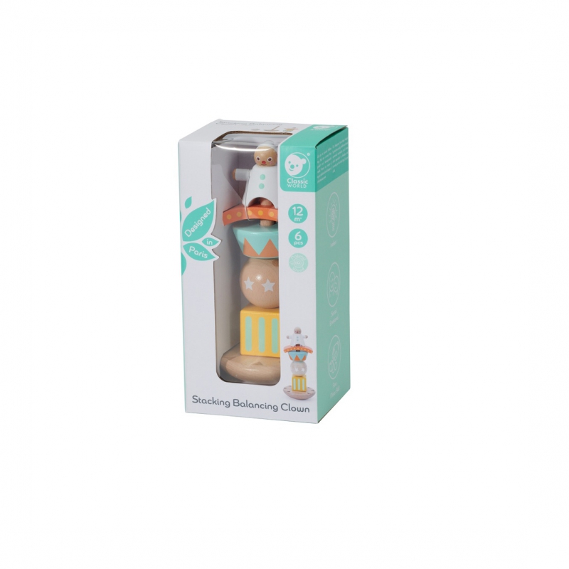 CLASSIC WORLD Drewniany Balansujący Klaun to piękna, pastelowa drewniana zabawka do układania, zaprojektowana, aby bawić maluchy, jednocześnie je ucząc. Zabawa polega na ułożeniu na paliku odpowiednio klocków tak, by klaun był na górze. Daje godziny zabawy dla jednej osoby lub całej rodziny. Gra pomaga maluchom rozwijać umiejętności koordynacji wzrokowo-ruchowej i rozpoznawania kolorów.