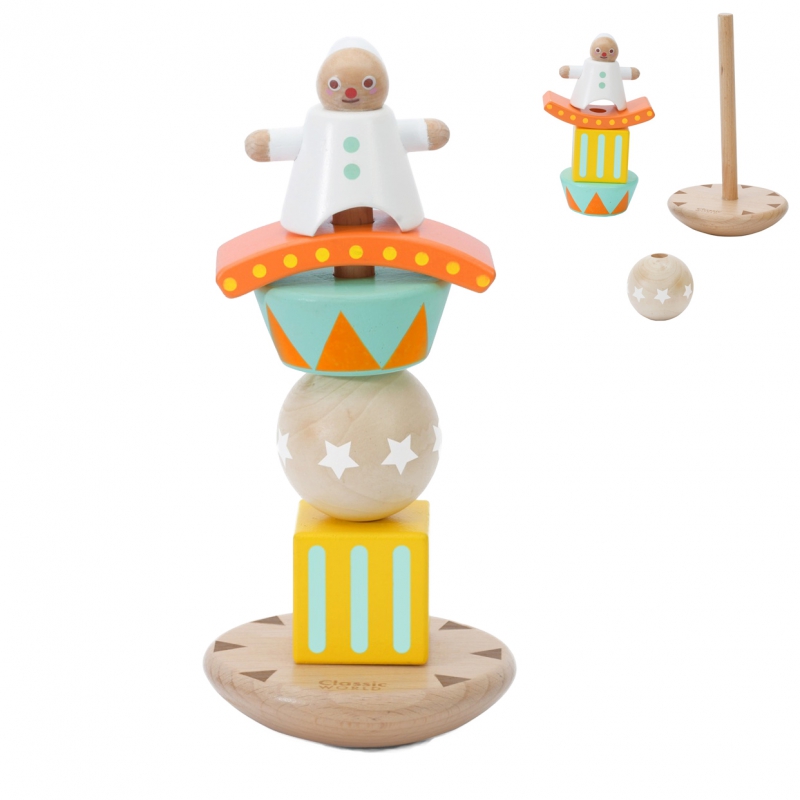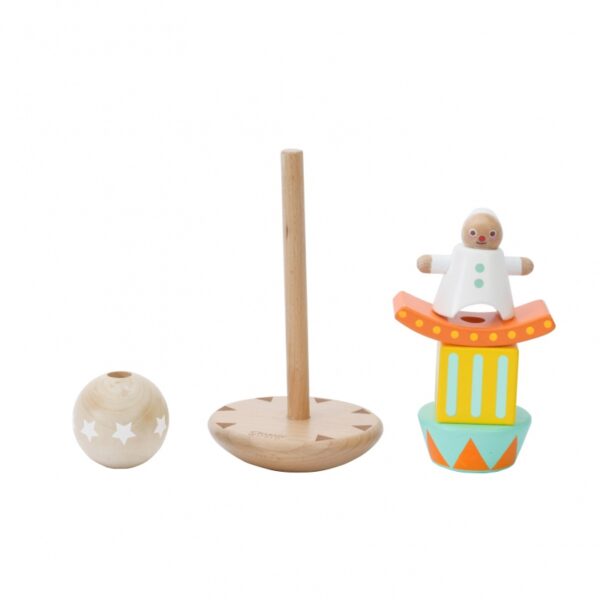 - – Zestaw zawiera cztery kolorowe drewniane elementy, stojak z palikiem do układania klocków, oraz wesołego klauna.
