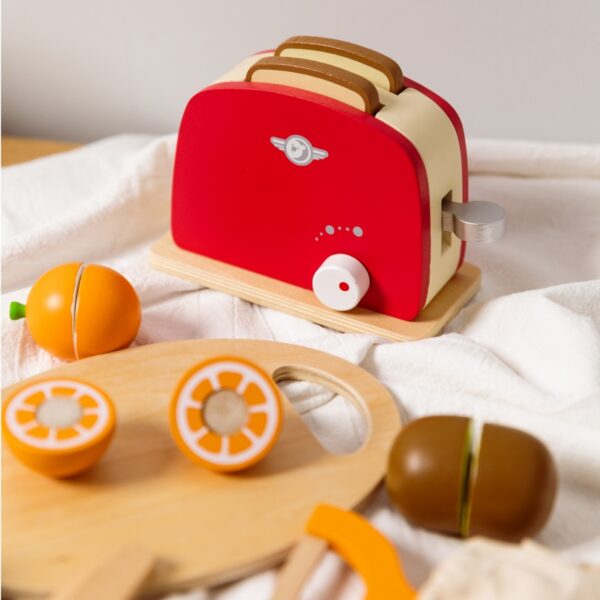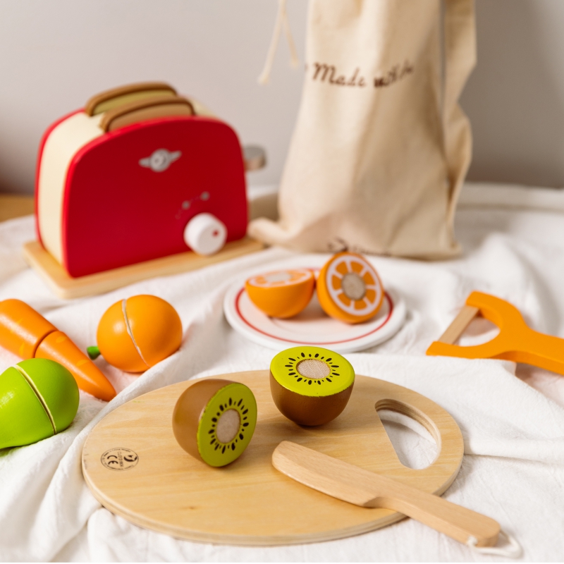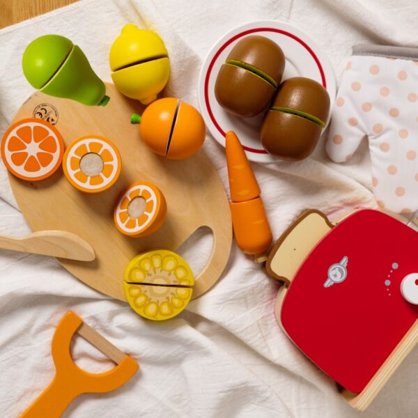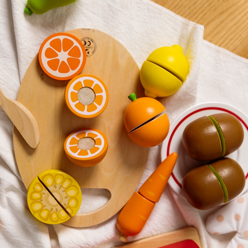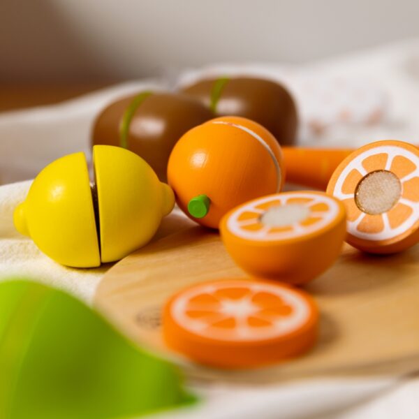 - – Dzieci, które wyjątkowo lubią obserwować co się dzieje w kuchni mogą spróbować swoich sił na drewnianej desce z owocami, których części połączone są za pomocą rzepa.