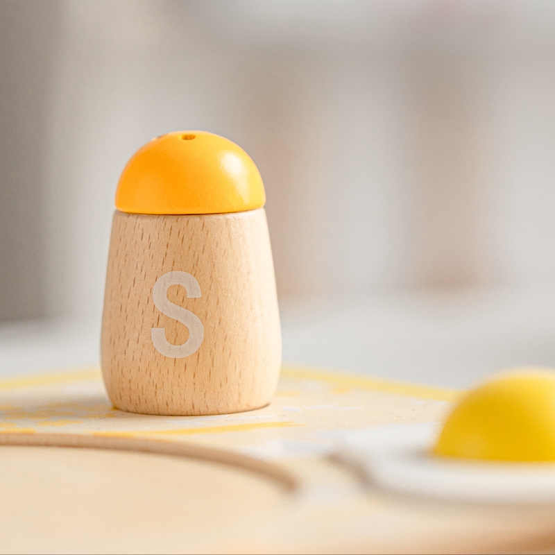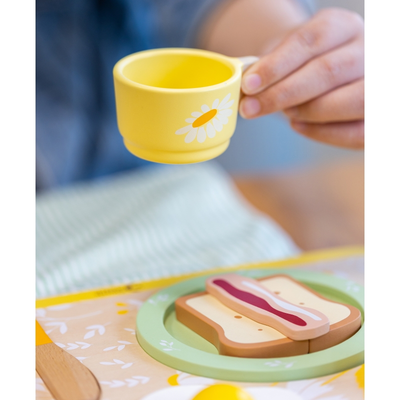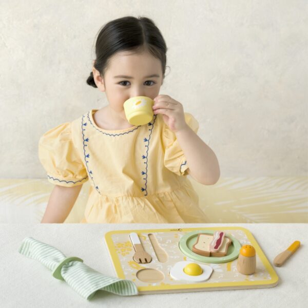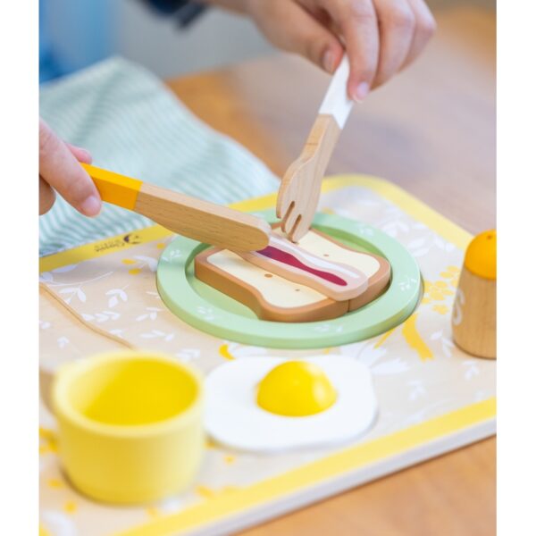 - – zestaw zawiera talerzyk, sztućce, kubek, sól, pieprz, jajko, tosty, plaster bekonu, serwetkę oraz tackę do serwowania,