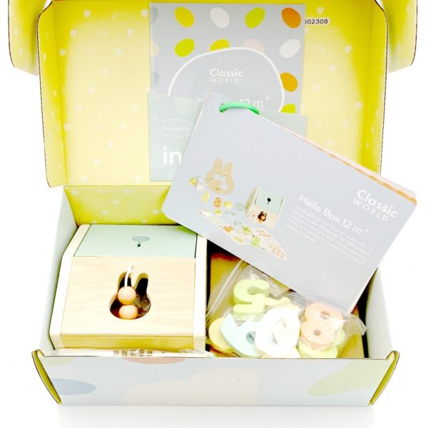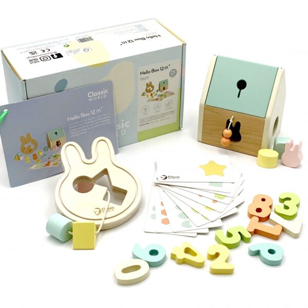 Powitalny BOX do nauki od marki CLASSIC WORLD to uroczy zestaw upominkowy dla dla dzieci w wieku od 12 do 18 miesięcy, który wykorzystuje ich niepohamowaną ciekawość świata. Zestaw zawiera sorter, układanki do nauki liczenia ze wzorami, klocki oraz zabawkę do przewlekania w kształcie królika. Dzieci mogą rozwijać eksplorację wzrokową i umiejętności motoryczne. Zestaw buduje i kieruje ich zdolnościami w sposób zrównoważony.