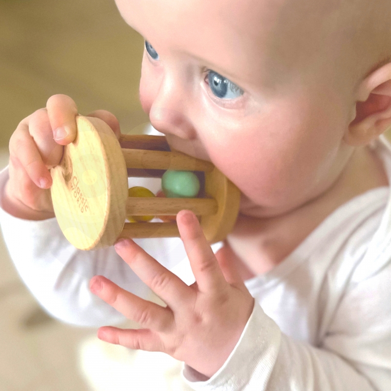 Bezpieczna, drewniana z kolorowymi kuleczkami w środku. Gdy dziecko potrząsa zabawką, zaczyna rozumieć zależność pomiędzy ruchem a dźwiękiem, co wspiera rozwój umiejętności poznawczych oraz zrozumienie związków przyczynowo-skutkowych. Dodatkowo zabawka pozytywnie wpływa na: