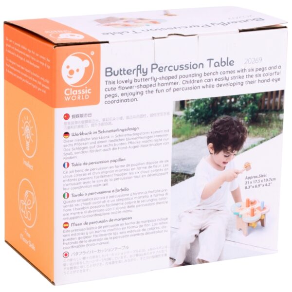 Oto idealna zabawka dla maluchów, które uwielbiają uderzać, stukać i odkrywać dźwięki! Drewniany stolik w kształcie motyla to kolorowa i angażująca forma zabawy, która wspiera rozwój motoryczny i koordynację ręka-oko. W zestawie znajduje się młoteczek w kształcie kwiatka, który dodaje uroku i zachęca dzieci do aktywnej zabawy.