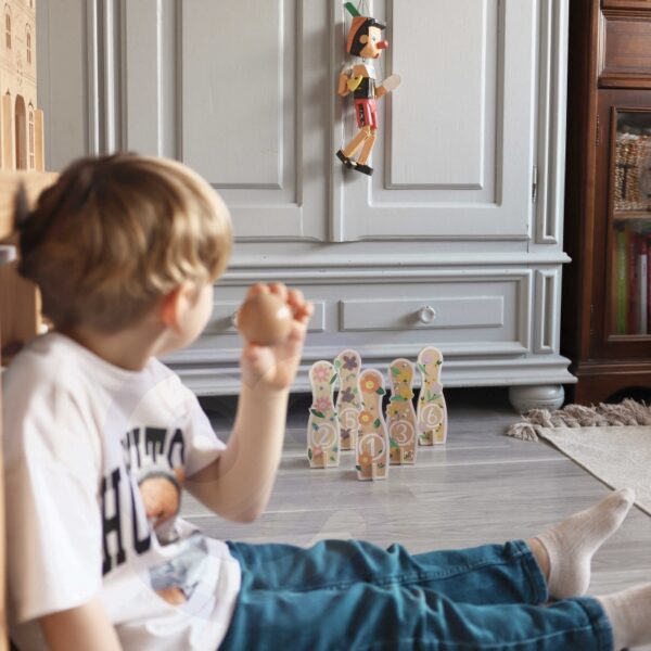 Drewniane Kręgle od marki CLASSIC WORLD to wszystko czego dzieci potrzebują, aby rozwijać zdolności ruchowe i jednocześnie świetnie się, przy tym bawić. Zestaw zawiera 6 kręgli, 1 piłkę oraz worek do przechowywania. Nie musimy przekonywać, że gra w kręgle będzie wspaniałą zabawą dla Twojego maluszka, ale również dostarczy wiele korzyści edukacyjnych. Zabawka rozwija zdolności motoryczne Twojego dziecka poprzez m.in.: bieganie i rzucanie.