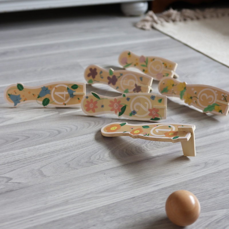 - – kręgle przedstawiają rysunki kwiatków,