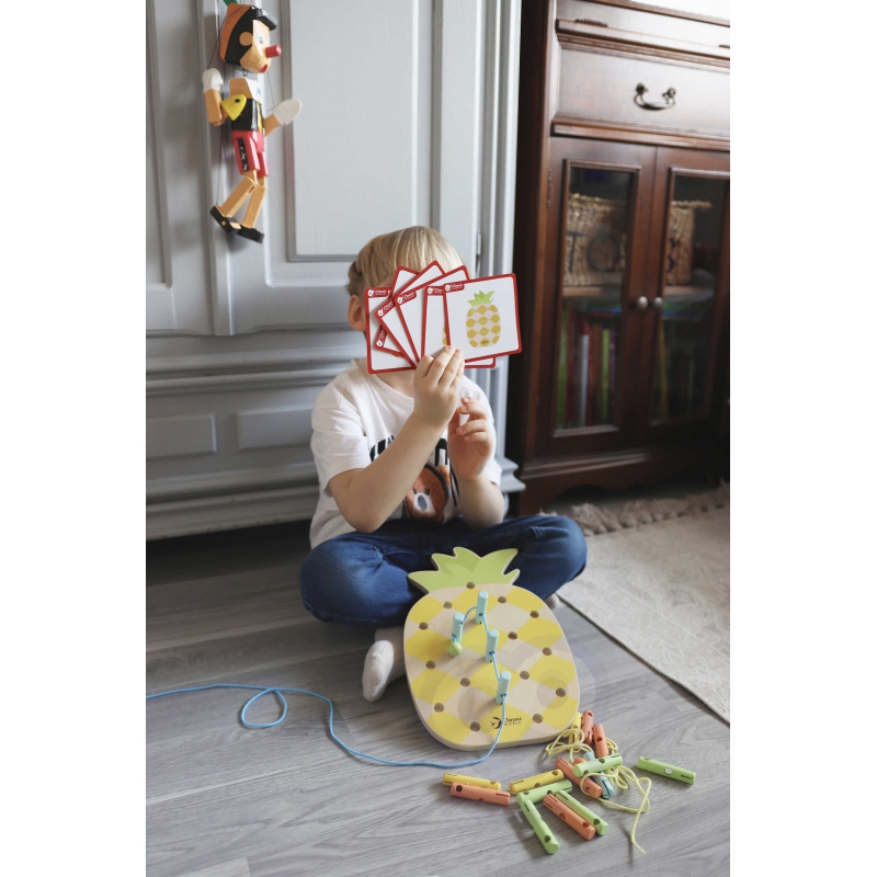 Drewniana Nawlekanka Ananas Kołeczki od marki Classic World to klasyczny zestaw różnokolorowych kołeczków z dziurkami przez które dziecko przeplata sznureczek. Kołeczki można układać w dowolnie wymyślone wzory, co wpłynie pozytywnie na kreatywność malucha i dodatkowo pobudzi jego wyobraźnię. Zabawka zapewni wiele godzin zabawy dla twojego dziecka jednocześnie ćwicząc jego skupienie i koncentrację. Każdy element wykonany jest z dobrej jakości drewna i pomalowany nietoksyczną farbą, dzięki czemu produkt jest w pełni bezpieczny dla dziecka.
