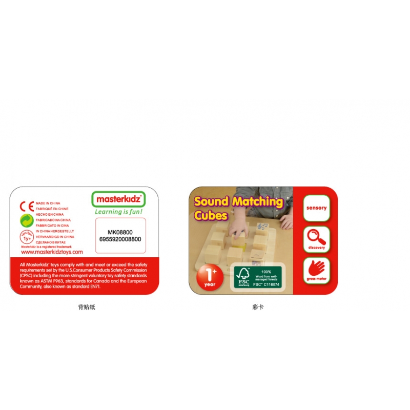 - – Zestaw składa się z planszy, oraz ośmiu drewnianych kostek, które wydają różne dźwięki podczas potrząsania. Zadaniem dziecka jest dopasowanie kostek w pary, sugerując się wydawanymi dźwiękami. Należy odnaleźć pary kostek, które wydają taki sam dźwięk.