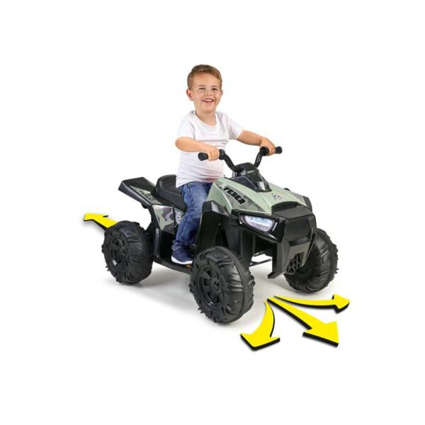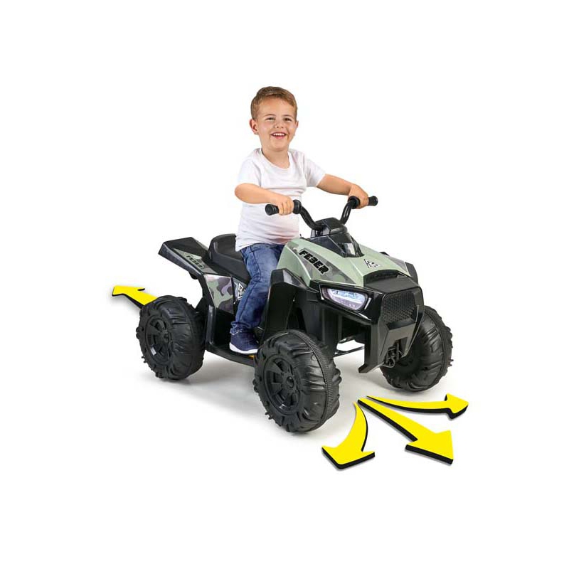 Niesamowity pojazd elektryczny od renomowanej, hiszpańskiej marki Feber. Barwa moro nadaje terenowego wyglądu. Quad został wyposażony w duże i wytrzymałe koła, które zapewnią lepszą przyczepność, oraz przy użytkowaniu w domu są ciche i nie niszczą podłóg. Wyposażony został w akumulator o mocy 12V, bieg do przodu i do tyłu, oraz hamulec nożny.