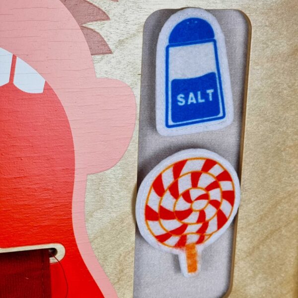 - – Zestaw zawiera produkty spożywcze, które za pomocą rzepów trzeba dopasować do odpowiedniego smaku na języku.