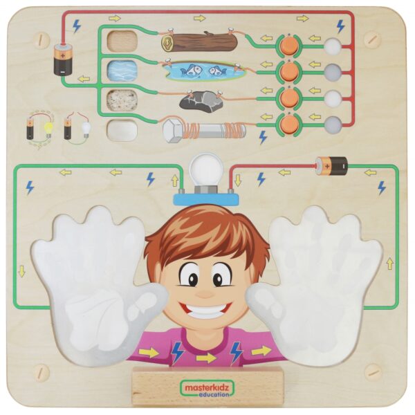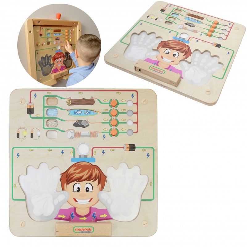 - – każdy przycisk reprezentuje inny rodzaj materiału o różnej zdolności przewodzenia prądu – dzięki czemu dziecko nauczy się, które materiały są materiałami izolacyjnymi – po naciśnięciu odpowiedniego zapali się światełko