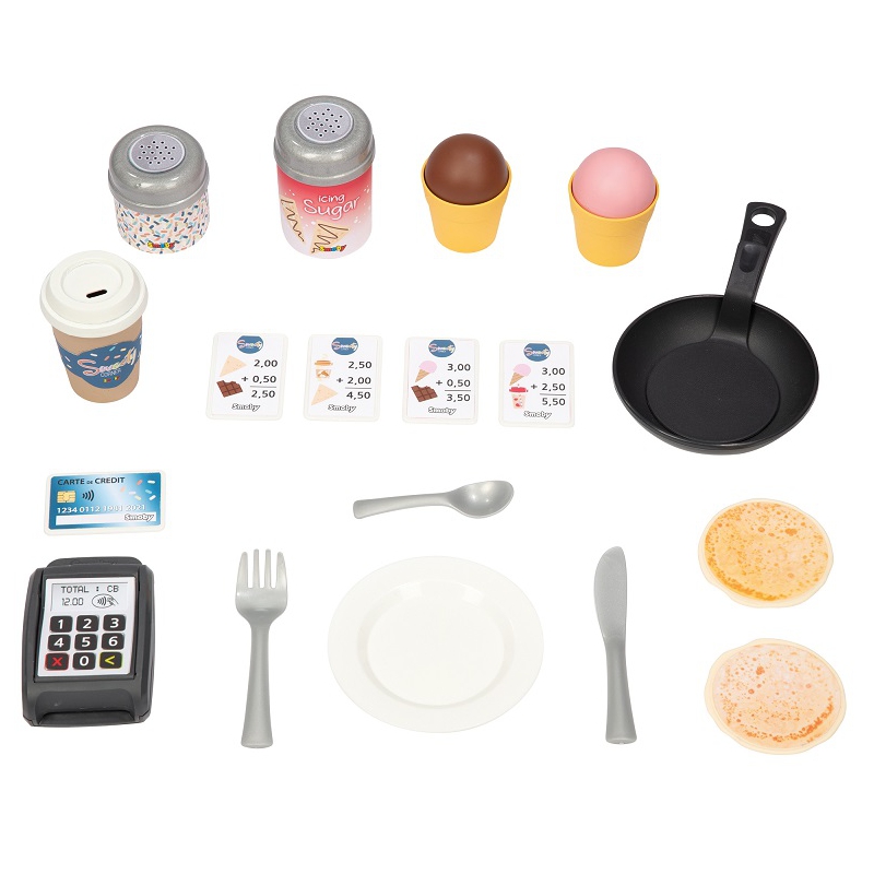 - – w zestawie znajdziemy 18 akcesoriów – naleśniki, lody, posypki, sztućce, karty kredytowe, bilony,