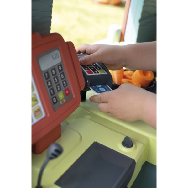 - – Funkcjonalna kuchnia: Domek wyposażony jest w lodówkę, piekarnik, kuchenkę gazową, zlew z kranem oraz kasę fiskalną z czytnikiem kart. To prawdziwe zaplecze do zabawy w restaurację!