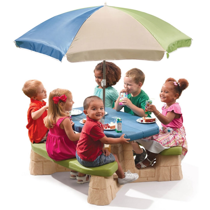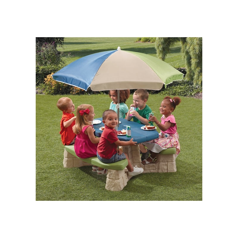 Stół piknikowy dla sześciorga dzieci z dwoma ławeczkami o specjalnym wyprofilowanym siedzisku. Wykonany z masywnego tworzywa sztucznego o podwójnych ściankach wypełnionych w środku powietrzem.Znaczna grubość elementów minimum 5 – 6 cm pozwala na długie użytkowanie stolika, a duży ponad 100 cm długości i szerokości 50 cm masywny blat oraz stabilna konstrukcja stołu zapewnia bezpieczeństwo zabawy. Dołączony parasol chroni przed promieniowaniem UV. Wysokość od ziemi do blatu stolika minimum 50 cm pozwala na korzystanie ze stolika dzieciom o różnym wzroście.