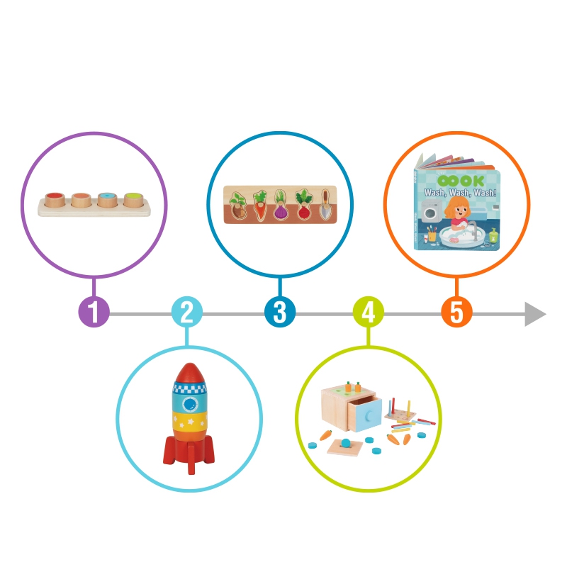 Ten edukacyjny zestaw zabawek pomaga dzieciom rozwijać umiejętności motoryczne, koordynację ręka-oko, rozpoznawanie kolorów, krytyczne myślenie i umiejętności rozwiązywania problemów. Pomaga także małemu dziecku odkrywać świat, dotykając różnych przedmiotów i obserwując rezultaty swoich działań. Zabawka ma kilka poziomów: