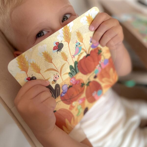 Wylosuj lub wybierz dowolną kartę i policzcie ile jest zwierzątek. Na odwrocie kart znajdziecie odpowiedzi do zadania, dzięki temu dziecko może grać także samodzielnie. Na drewnianej tabliczce znajdziecie pinezkę z biedronką, pszczółką, ślimakiem, ptaszkiem lub gąsienicą i zaznaczcie ile jest ich na obrazku. Poćwiczcie przy tym polskie i angielskie nazwy zwierzątek.