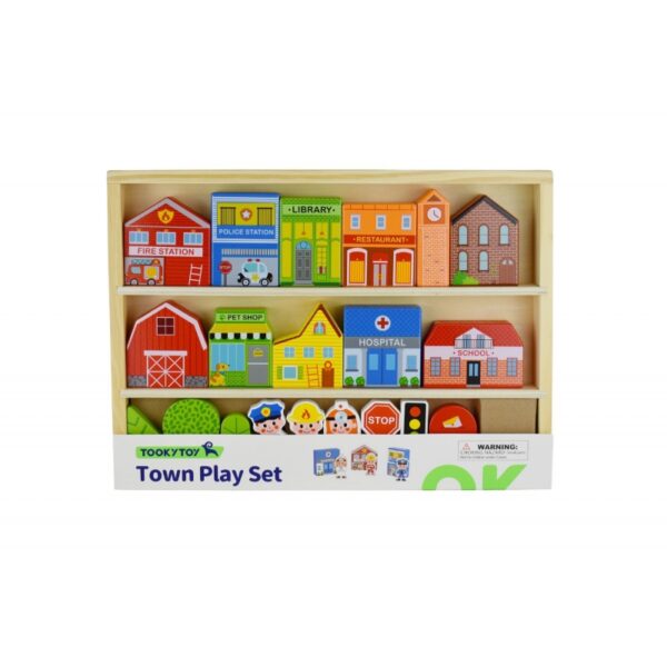 Zestaw Budynków i Figurek od marki TOOKY TOY pozwoli zbudować swoje małe miasteczko i zacząć odrywać figurkami różne scenki, które mogłyby się w nim wydarzyć. Komplet pozwala na samodzielną zabawę, ale jest również doskonałym uzupełnieniem innych zestawów. Zestaw zawiera drewniane pudełko z przegródkami, 11 figurek budynków, 3 figurki postaci, w tym: strażaka, policjanta i lekarza oraz 6 figurek innych obiektów: znak stopu, światła drogowe, dwa drzewka, krzew i skrzynkę na listy. Poprzez odgrywanie ról dziecko rozwija swoją kreatywność, wyobraźnię oraz umiejętności społeczne. Całość wykonana z najwyższej jakości materiałów i pomalowana nietoksycznymi farbami bezpiecznymi dla dzieci i środowiska.
