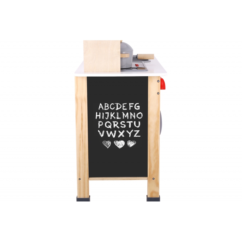 Przepiękna Kuchnia od marki TOOKY TOY to świetna propozycja dla dzieci które lubią wcielać w różne role osób dorosłych podpatrzonych w życiu codziennym. Zestaw zawiera wiele obszarów funkcjonalnych, takich jak zlew, kuchenka, szafki oraz wiele innych. Po lewej stronie znajduje się tablica, po której dzieci mogą pisać. Na kuchence natomiast można symulować gotowanie, zyskując niesamowite wrażenia kulinarne.