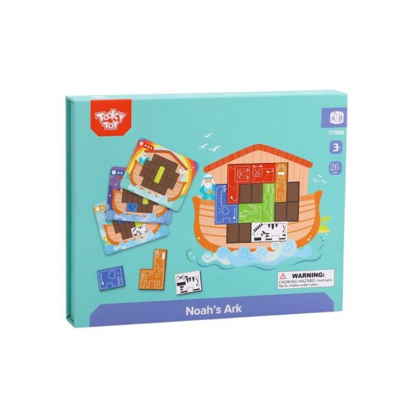 Układanka Arka Noego od marki TOOKY TOY. Zabawka posiada 10 klocków z wizerunkami zwierząt i 15 plansz dwustronnych z 30 wzorami z różnym poziomem do ułożenia. Tak jak Noe, dziecko musi dopasować tak zwierzęta w arce, aby zapełnić całą plansze. Zabawka rozwija zdolności manualne, logiczne myślenie oraz poprawi koncentracje Twojego dziecka. Oprócz świetnej zabawy, układanka logiczna pozwoli poznać historię Arki Noego i zaciekawić dziecko.