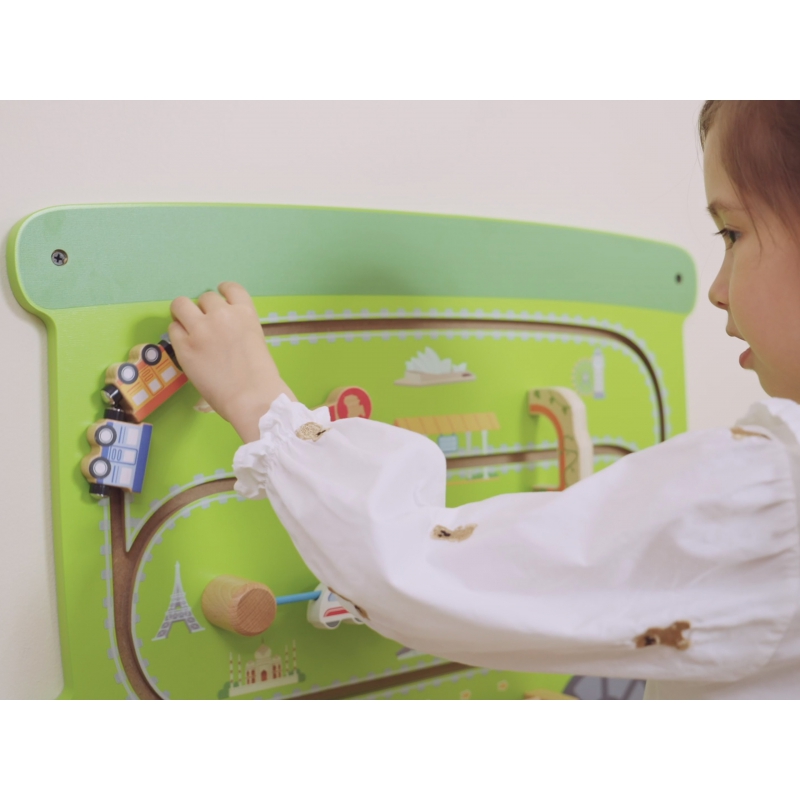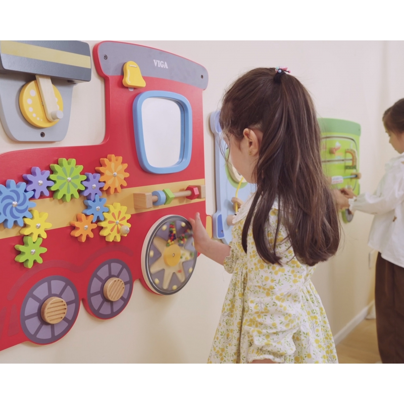 Kolorowy zabawkowy pociąg marki Viga Toys to drewniana, wielofunkcyjna zabawka na ścianę, która dostarczy dzieciom wiele godzin świetnej zabawy i nauki. Zabawka składa się z trzech odrębnych sekcji: czerwona lokomotywa z kołami zębatymi, młyńskim kołem i lustrem; niebieski wagon z cymbałkami, pętlą motoryczną i wyrzutnią koralików; oraz zielony wagon z interaktywną przesuwną kolejką i klockami do obracania przedstawiającymi sławne miejsca. Każda sekcja oferuje różnorodne atrakcje, które stymulują zmysły i umiejętności maluchów, zapewniając im jednocześnie mnóstwo radości.