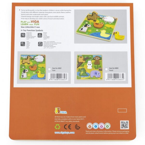 Klasyczne Drewniane Puzzle od marki VIGA w motywie lasu. W zestawie znajduje się kolorowa plansza oraz 5 elementów ze zwierzątkami. Zabawa polega na dopasowaniu kafelków zwierząt do odpowiednich miejsc na kolorowej podstawce. Taka zabawa pomoże kształtować precyzję ruchów rączek, oraz poprawić koordynację wzrokowo-ruchową, a także ćwiczyć pamięć, logiczne myślenie i koncentrację.