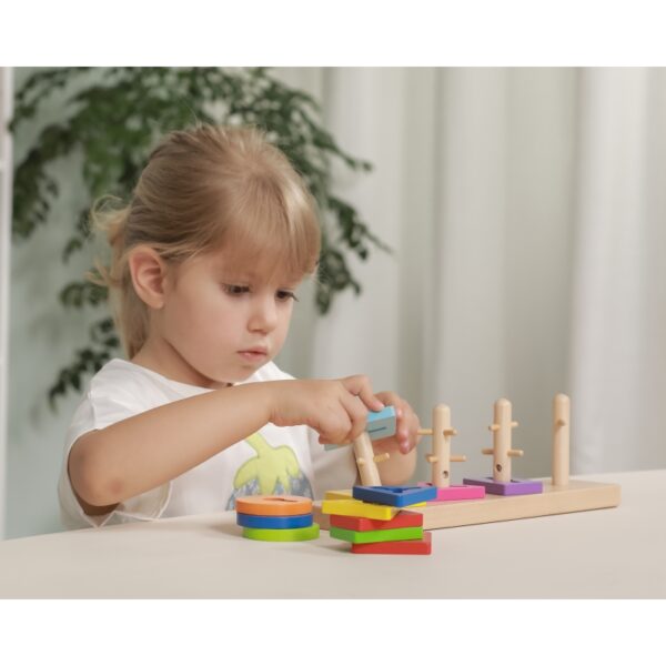 Drewniany Sorter Geometryczny marki Viga, to zabawka edukacyjna do nauki liczenia oraz rozróżniania kształtów i kolorów. Na każdym z pięciu trzonków trzeba umieścić odpowiednie kształty, a utrudnienie z pozoru prostej zabawy polega na tym, że klocki trzeba dopasować do odpowiednich wypustek. Podczas zabawy dziecko rozwija zdolności manualne, koordynację ręka-oko oraz umiejętność logicznego myślenia. Żywe kolory przykuwają wzrok malucha i stymulują ten zmysł. Sorter został pozbawiony ostrych krawędzi, a zastosowanie nietoksycznych farb zapewnia bezpieczeństwo dla dzieci i środowiska.