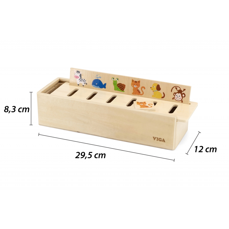 Drewniany Edukacyjny Sorter od renomowanej marki VIGA to idealna zabawka dla dzieci, które zaczynają poznawać świat. Ładne, z wysokiej jakości drewna pudełko posiada 6 przegródek na zdejmowanym wieczku, w które wrzuca się drewniane klocki z odpowiednią kategorią. Zestaw zawiera 4 długie deseczki oraz 48 sztuk drewnianych klocków z kategoriami warzyw, owoców, transportu, kształtów, zwierząt i liczb. Należy umieścić jedną z desek na wieczku, a następnie znaleźć pasujący obrazek, aby włożyć go do odpowiedniej przegródki. Dzięki tej zabawie twoje dziecko nauczy się podstawowych materiałów z życia codziennego i nauczy się je kategoryzować.