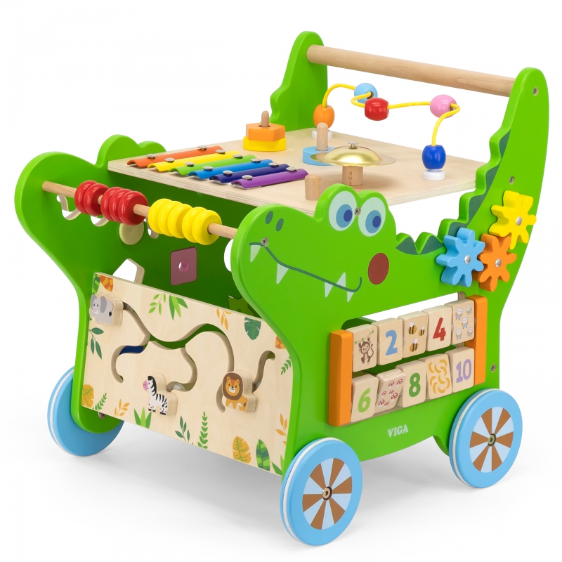 Drewniany Chodzik Krokodylek od marki VIGA zawiera w sobie pełnię ekscytujących aktywności dla malucha: labirynt zwierzątek, ksylofon, koła zębate, sorter kształtów, liczydło i wiele innych. Wytrzymała konstrukcja oferuje stabilne wsparcie, by maluszek pewnie mógł rozpocząć naukę chodzenia i pomaga mu utrzymać równowagę. Korzystając z aktywności zawartych w tym chodziku dziecko będzie mogło rozwijać swoje zdolności manualne, koordynację wzrokowo–ruchową, logikę, a także rozpocznie naukę kształtów, kolorów i liczb. Posiada przestrzeń na trzymanie ulubionych zabawek.