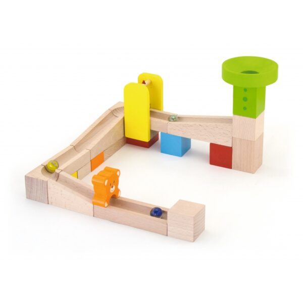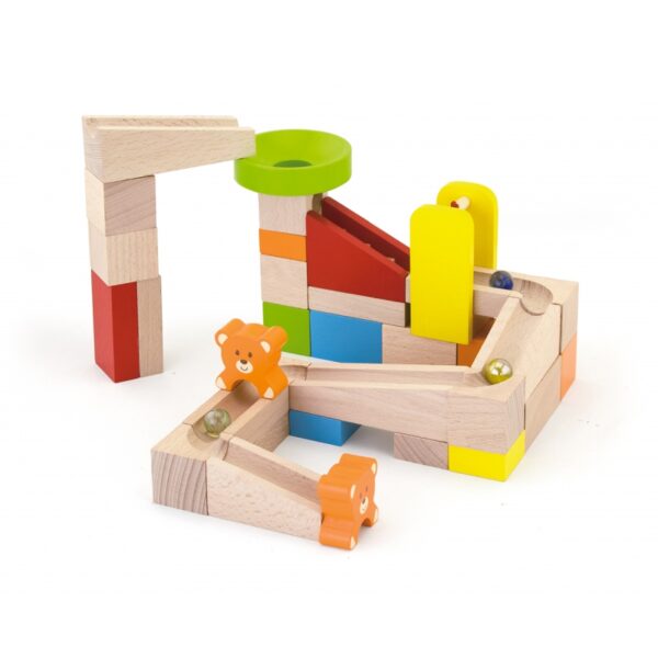 Budowla Kulodrom, składająca się z wysokiej jakości drewnianych, naturalnych bloczków, oferuje małym architektom wiele możliwości kreatywnej i odkrywczej oraz pomysłowej zabawy. W zestawie znajdują się 10 kart przedstawiających kombinacje ustawień kulodromu, o różnym poziomie trudności. Spróbujcie zbudować tor przedstawiony na karcie lub stwórzcie własną fantastyczną konstrukcje z 49-ciu elementów! Zestaw zawiera schodki i misie zapewniające dodatkową atrakcje dla twojej pociechy. Całość zapakowana w wygodne wiaderko z uchwytem, ułatwiające bezpieczne przechowywanie części oraz przenoszenie zabawki.