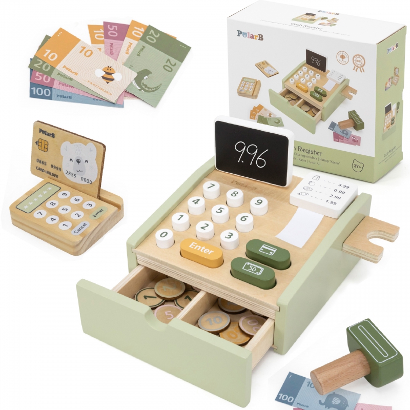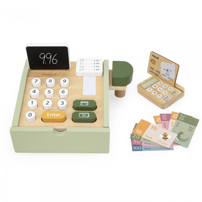 Kasa sklepowa to świetna drewniana zabawka, która pozwoli na odegranie wielu scenek, jakie mogą mieć miejsce w sklepie. Dzieci mogą wcielić się w role kasjera, lub klienta, oraz wspólnie ćwiczyć interakcje społeczne, oraz swoje zdolności komunikacyjne. Gotówka, czy karta? Policz sumę należności, przyjmij pieniądze i wydaj poprawnie resztę. Kasa zawiera banknoty, monety, oraz kartę płatniczą. Dziecko może uczyć się bawiąc! Królowa Nauk – matematyka nie będzie już straszna.