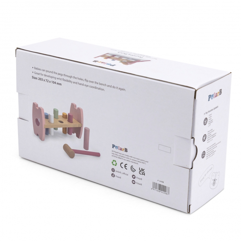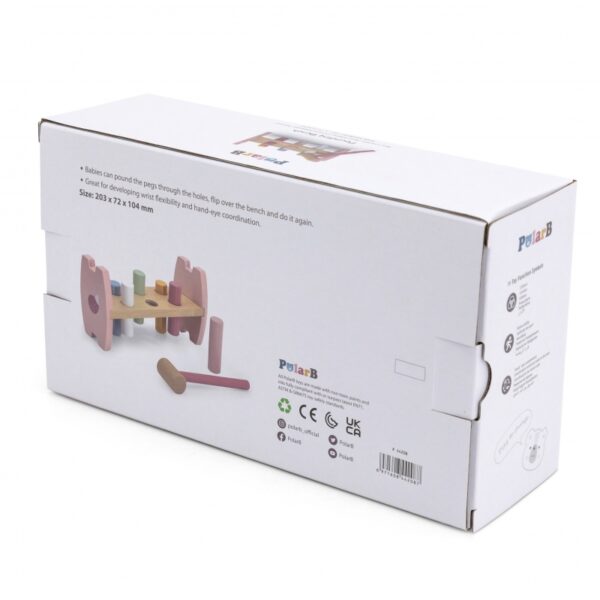 - – Zestaw zawiera podstawkę, 6 kolorowych kołków, młoteczek do wbijania