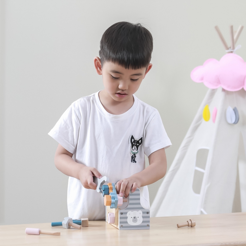 Zestaw drewnianych narzędzi marki Viga z serii Polar Bear – zestaw narzędzi z motywem niedźwiedzia polarnego z pewnością przypadnie do gustu małym rzemieślnikom.