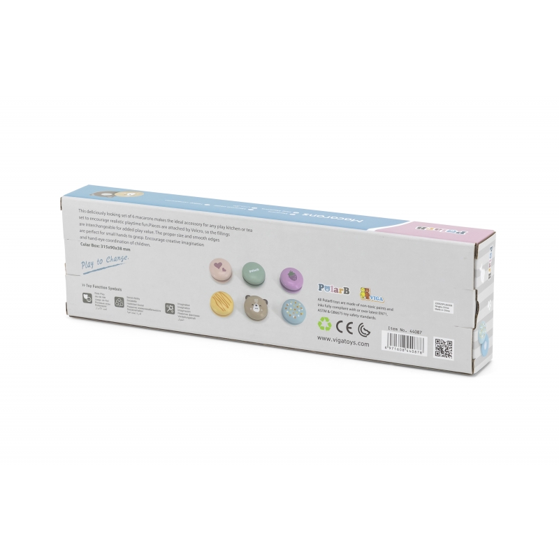 Drewniany Zestaw kolorowych makaroników od firmy Viga PolarB to jedna z czołowych zabawek, która pozwoli dziecku wejść do świata ciekawej i kreatywnej zabawy. Kawałki makaroników przymocowane są do siebie za pomocą rzepów dzięki czemu dzieci mogą w dowolny sposób łączyć je ze sobą tworząc własne „przysmaki”.