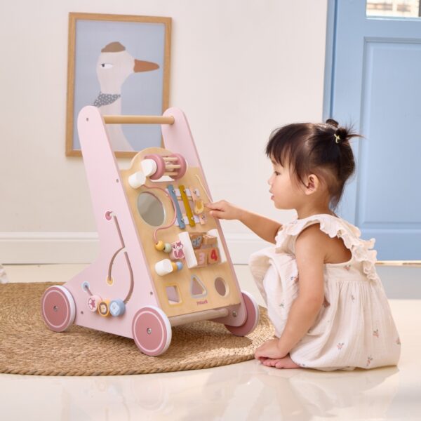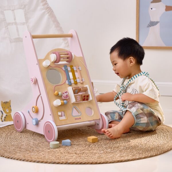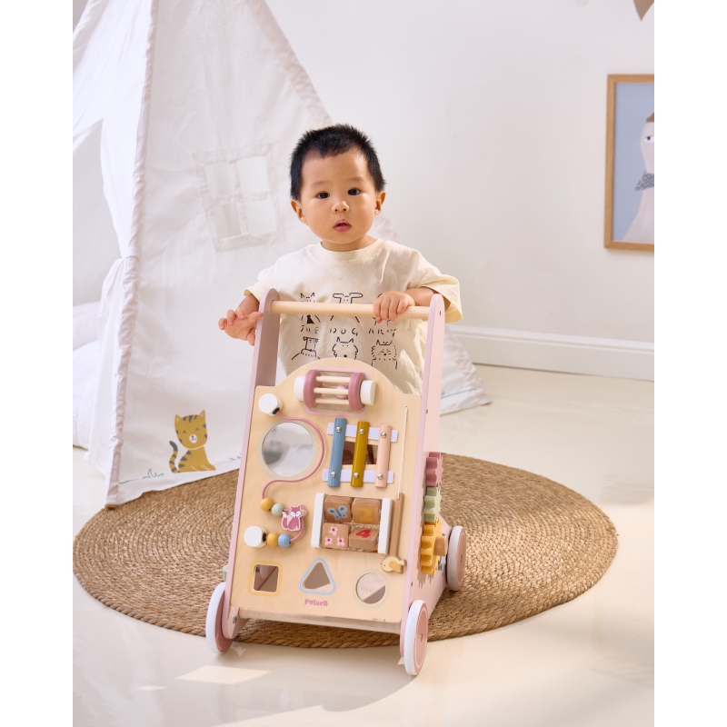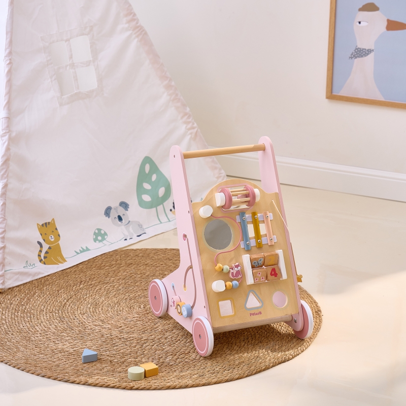Różowy Chodzik dla Maluszków od marki PolarB to świetna zabawa i nauka w jednym! Oferuje interaktywne aktywności, takie jak podglądanie się w lusterku, obracanie klocków, turlanie grzechotki, dopasowywanie kształtów oraz granie na cymbałkach. Dzięki temu chodzik zachęca dzieci do stawiania pierwszych kroków, co jest kluczowym etapem w ich rozwoju. Dodatkowo, z tyłu znajduje się praktyczny schowek, idealny na ulubione zabawki.