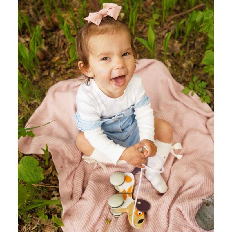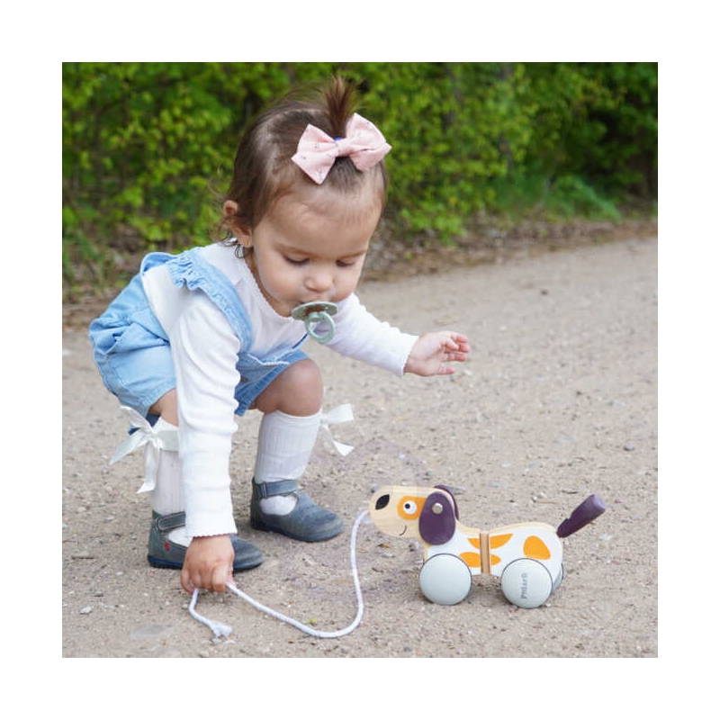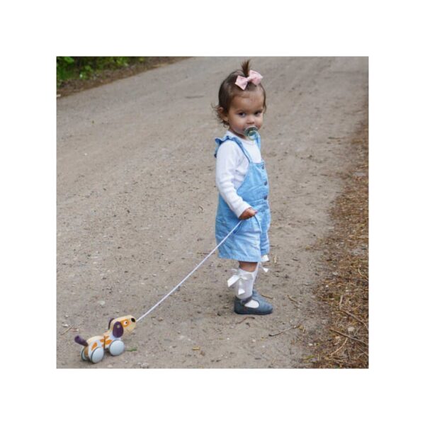 Mały szczeniaczek posiada smycz, która pozwoli wyprowadzać go na spacer po dywanie i nie tylko. Piesek podczas spacerów będzie bardzo grzeczny, a przede wszystkim będzie bardzo cichutko – na kółeczkach znajdują się gumowe nakładki. Nakładki wyciszą ewentualne stukanie. Kiedy mały smyk pociągnie za sznureczek, piesek zacznie się poruszać i wesoło merdać ogonkiem.