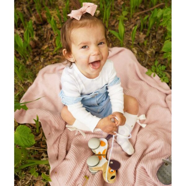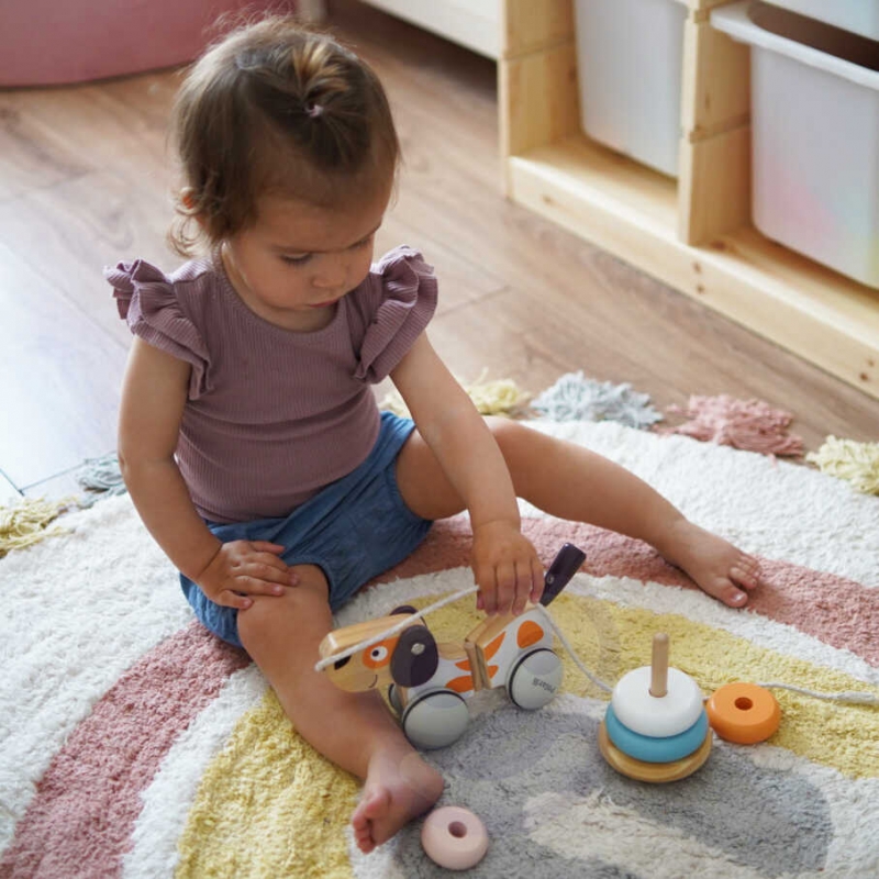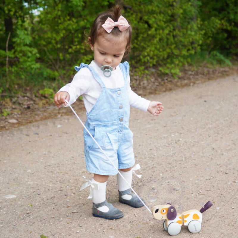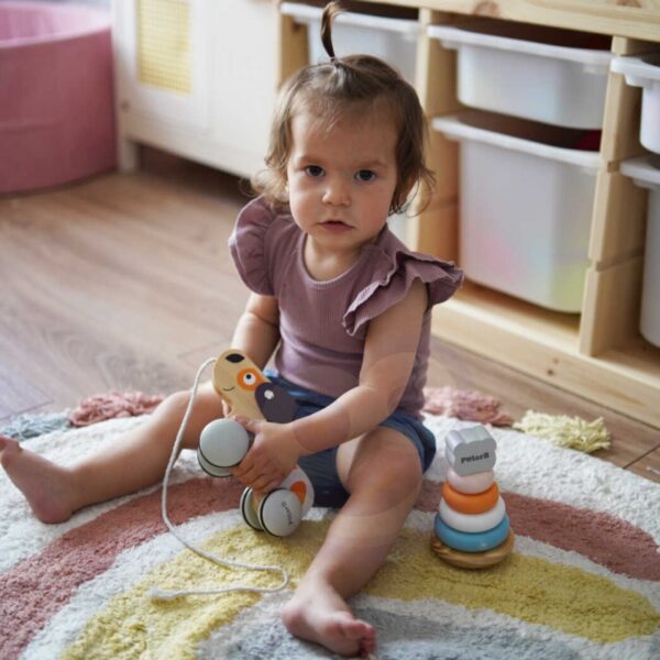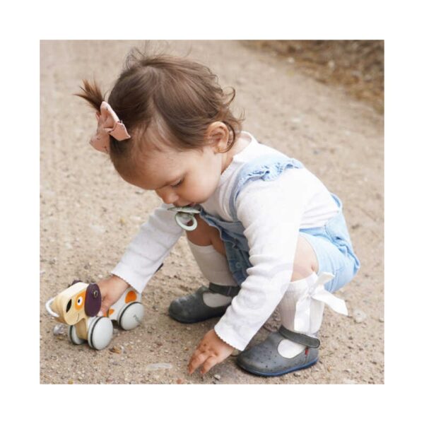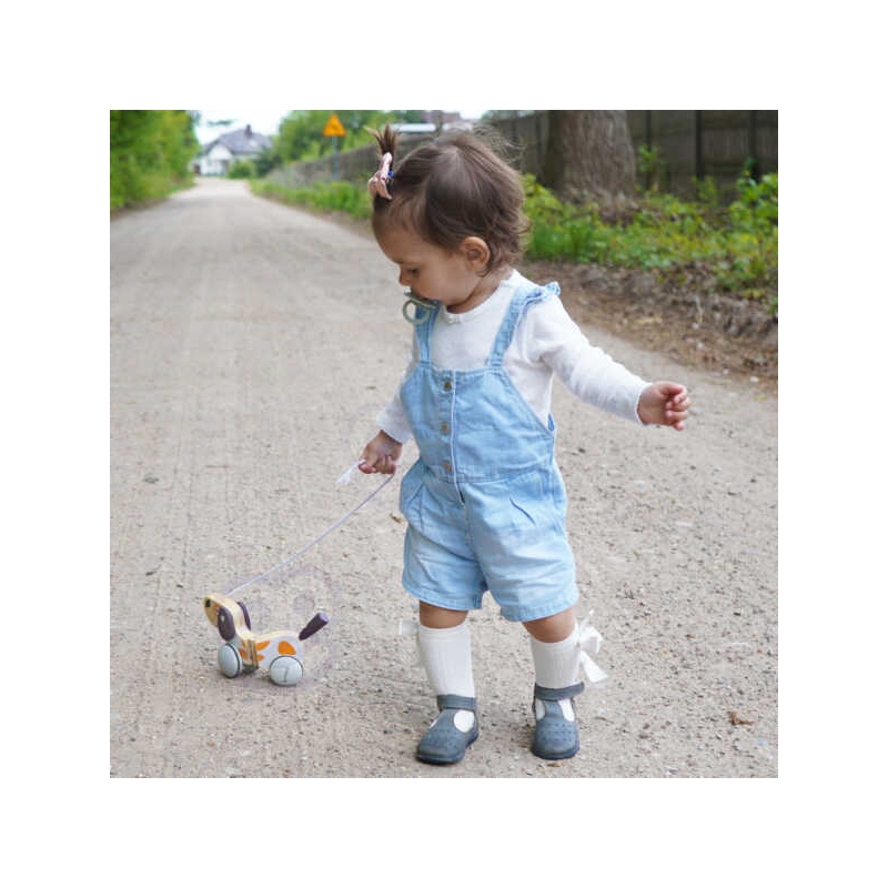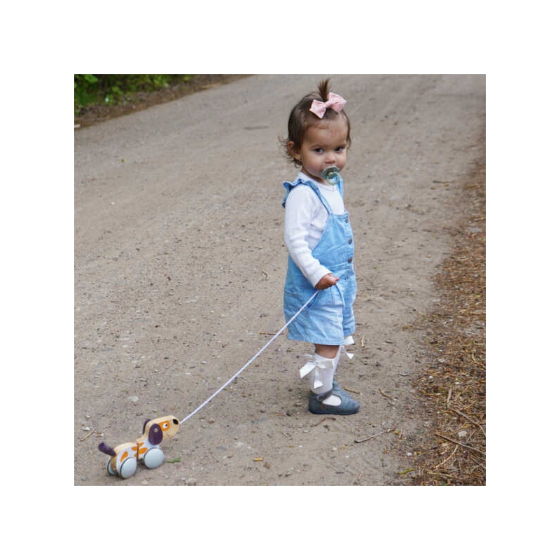 Polarny Drewniany Piesek na sznurku od firmy Viga Toys sprawdzi się jako dodatkowa zachęta do chodzenia dla dzieci, które uczą się stawiać pierwsze kroki. Modna i stonowana kolorystyka idealnie wzbogaci posiadaną kolekcję zabawek.