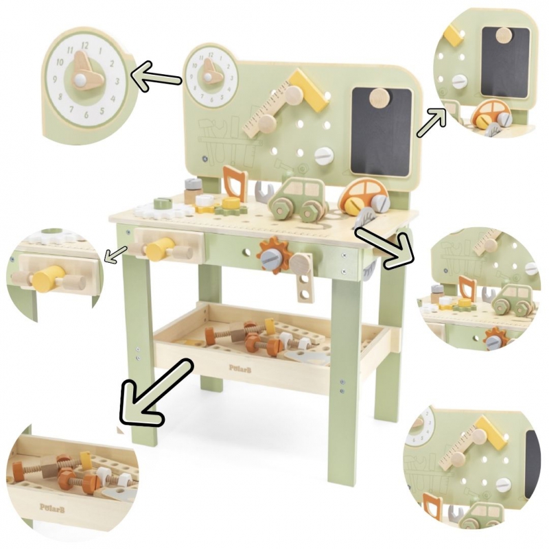 Warsztat majsterkowicza od marki Viga Toys z ekskluzywnej serii PolarB pozwoli poczuć się Twojemu dziecku jak prawdziwy mechanik. Dziecko może wbijać gwoździe, dokręcać śruby kluczem, a także przykręcać drewniane deski i zębatki do stołu warsztatowego. Zabawka posiada zegar ze wskazówkami, drewniane samochodziki oraz różne narzędzia.