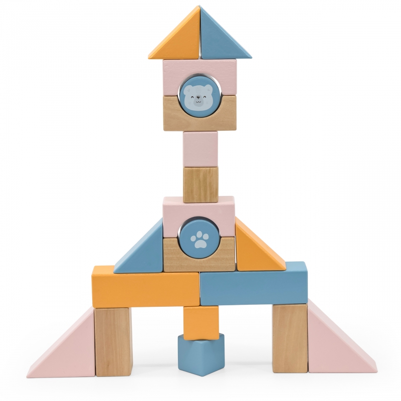 - – Zestaw zawiera 21 elementów w tym 20 klocków i wózeczek ze sznureczkiem