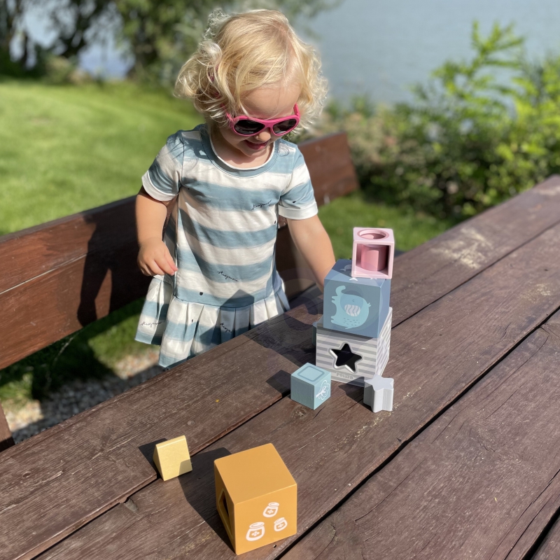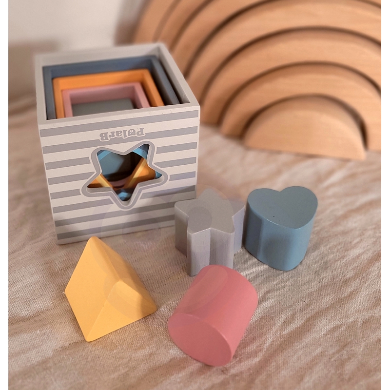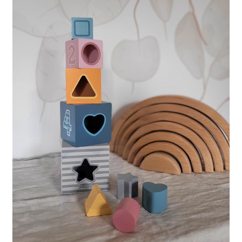 Kolorowa piramidka edukacyjna z sorterem kształtu to zabawka uwielbiana przez dzieci. Delikatne pastelowe kolory oraz estetyka wykonania, zachęcają dzieci do zabawy.