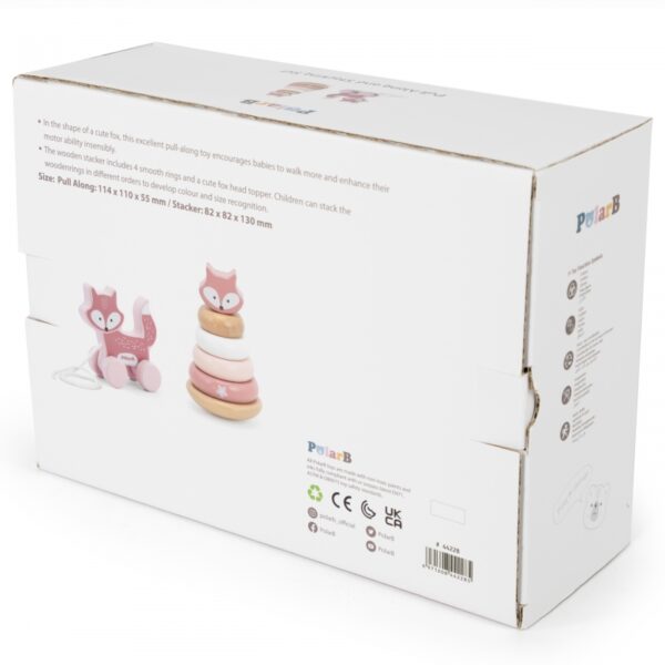 W tym zestawie od marki Viga z kolekcji PolarB znajdziemy dwie pastelowe, drewniane zabawki: Liska piramidkę edukacyjną oraz Liska do ciągnięcia. Obie zabawki nie tylko wypełnią czas dziecka świetną zabawą, ale przyczynią się do rozwoju zdolności motorycznych, logicznego myślenia oraz nauki kolorów.