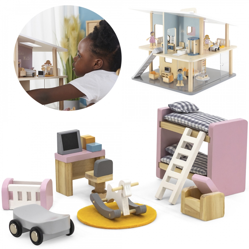Seria zestawu mebelków dla lalek od renomowanej firmy Viga to idealny prezent dla twojego dziecka. Seria zawiera 5 różnych pomieszczeń w innych kolorystykach. Stwórz swój własny domek dla lalek i układaj meble oraz pomieszczenia wedle własnego uznania. Produkt wykonany jest z wysokiej jakości materiału oraz z dużą dbałością o szczegóły. Zabawka pomalowana jest nietoksycznymi farbami w łagodnej kolorystyce.
