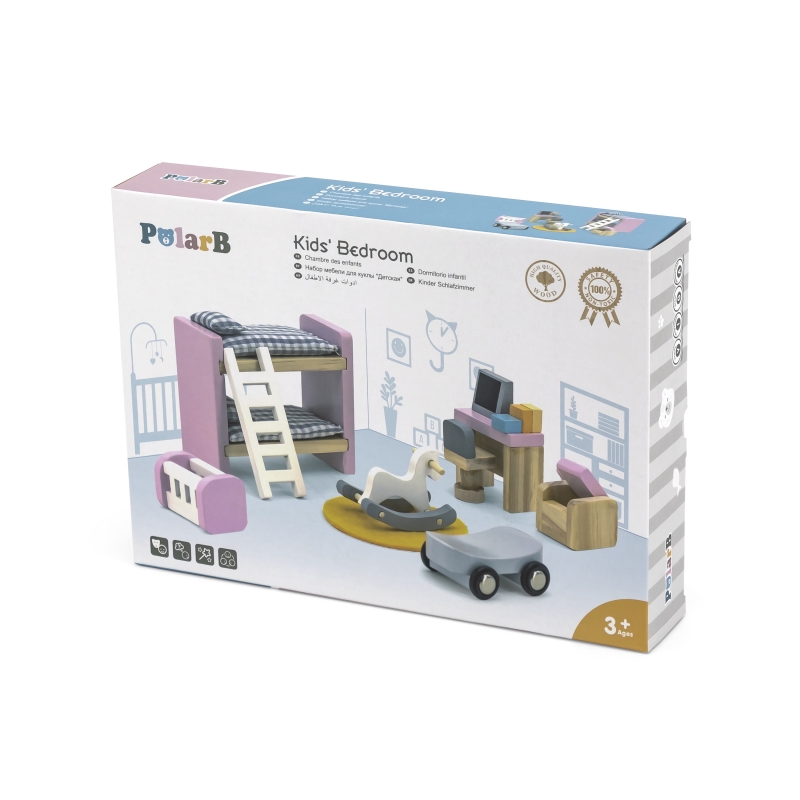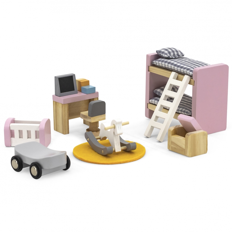 - – w skład zestawu wchodzi: biurko z komputerem, krzesełko, kołyska, łóżko piętrowe z drabinką, dywanik, jeździk, konik na biegunach oraz pufa,