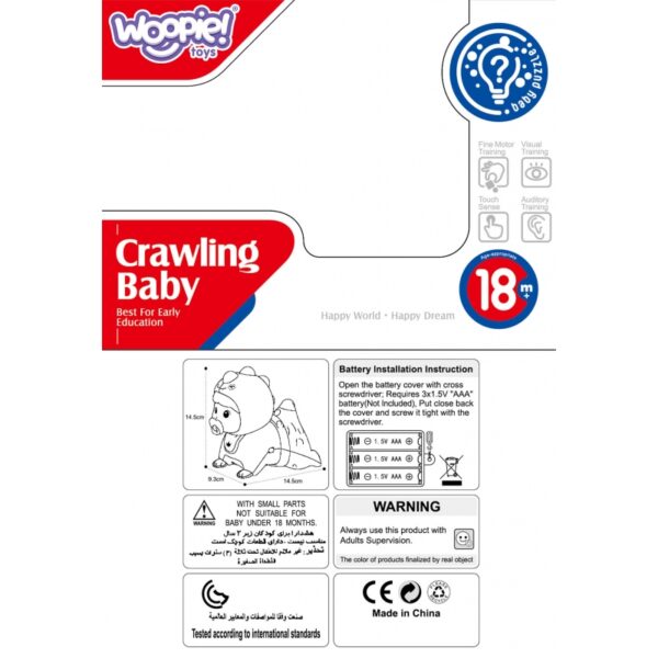 Raczkujący Bobas od marki WOOPIE to radosny bobasek, który został stworzony z myślą o dzieciach w wieku powyżej 18 miesięcy. Zabawka zachęca dzieci do podążania jego śladami przez co dziecko rozwija motorykę. Dla urozmaicenia zabawy Bobas jest wyposażony w melodyjkę stymulującą zmysł słuchu, a także efekty świetlne pobudzające zmysł wzroku. Produkt jest bezpieczny dla dziecka, nie posiada ostrych krawędzi jest wykonany z trwałego tworzywa. Świetnie spełni rolę jako przyjaciel dla Twojego malucha.