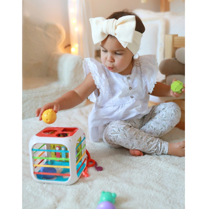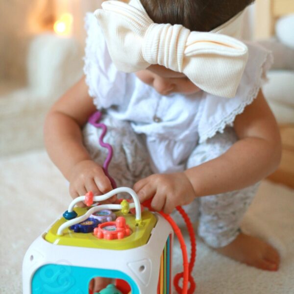 - – Każdy bok kostki to inna układanka kształtów, wzbogacona elastycznymi, kolorowymi wstążkami oraz sześcioma blokami do sortowania i układania, w których kryją się dzwoneczki.