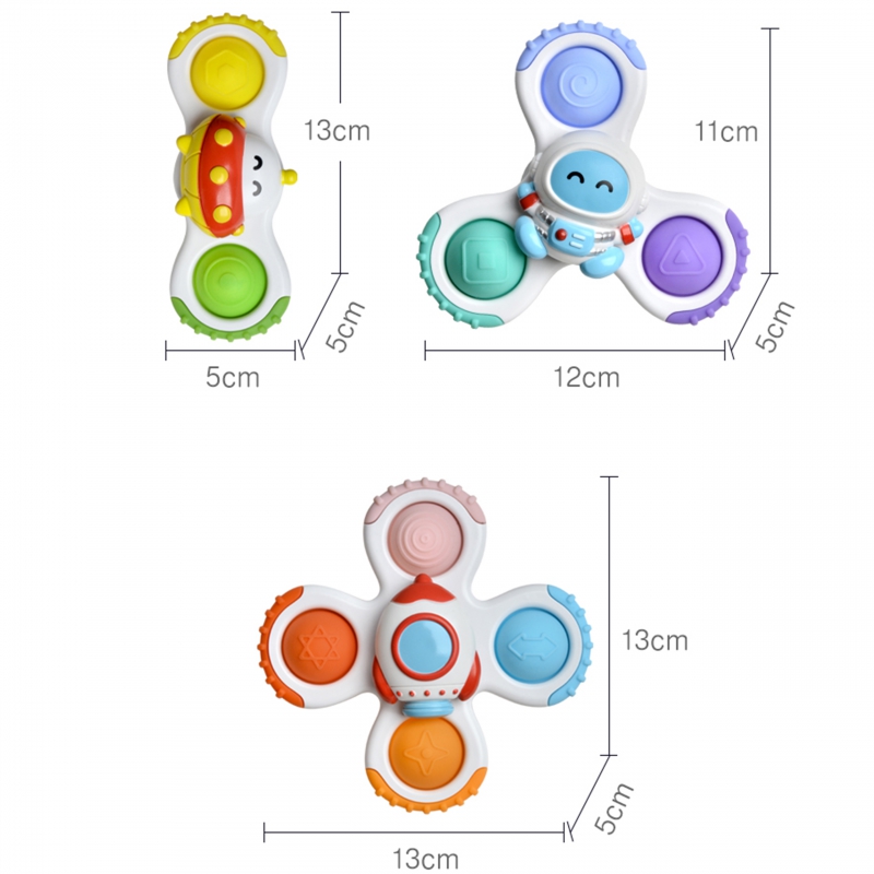 Zestaw Spinnerów od marki WOOPIE zrobi na dziecku duże wrażenie. W zestawie znajdują się 3 szt. spinnerów: rakieta, kosmita i ufo. Spinnery dziecko może zabrać wszędzie i przyczepić wszędzie dzięki gumowym przyssawkom. Można przyczepić spinnera zarówno do szyby w czasie podróży oraz do wanny podczas kąpieli (zabawkę można moczyć). Łożyska spinnerów gwarantują długotrwały obrót. Zabawki posiadają gumowe elementy do przyciskania co rozwinie zmysły dziecka oraz zadziała odstresowująco. Zabawa ćwiczy zwinność rączek u dziecka oraz poprawia koordynację ręka-oko.