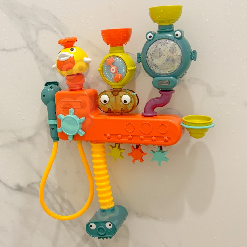 - – zabawka na plecach posiada 2 przyssawki, dzięki czemu można przyczepić ja do ściany w łazience lub do wanny