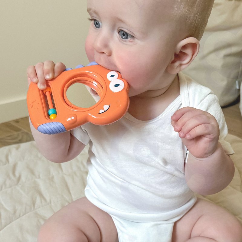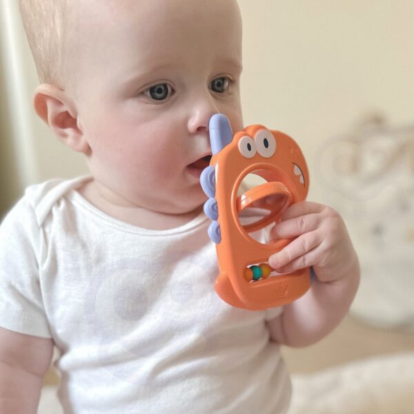 Kolorowy gryzak w kształcie Dinozaura od marki WOOPIE to idealna zabawka dla najmłodszych, zaprojektowana z myślą o niemowlętach, posiada budowę idealną dla rączek niemowlaka. Sprawdza się jako gryzak dzięki miękkim silikonowym elementom, kolorowe koraliki oraz lusterko zaciekawią każdego malucha.