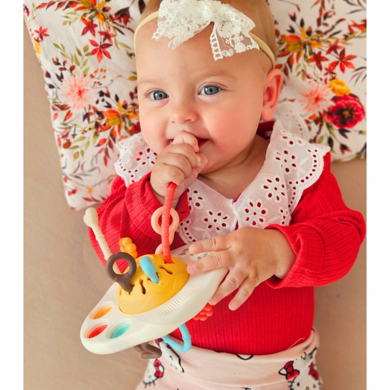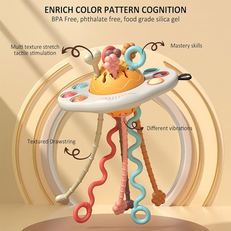 Zabawka Sensoryczna Montessori Gryzak „Przeciąganka” w kształcie UFO od marki WOOPIE to nie tylko doskonała rozrywka, ale i innowacyjny sposób na wspieranie rozwoju Twojego niemowlaka. Zachęca do odkrywania przez zmysły, skupia na rozwoju koordynacji i motoryki oraz łagodzi dyskomfort związany z ząbkowaniem. Zestaw zawiera kolorowe, bezpieczne i łatwe do uchwycenia przez małe rączki sznurki z różnorodnymi teksturami, które pobudzają do działania i eksploracji, jednocześnie oferując ulgę podczas ząbkowania. Pociąganie za sznurek wydaje różnorodne dźwięki i wibracje. Ponadto zabawka jest wyposażona w rząd miękkich przycisków, które zachęcają do dotyku i przyciskania. Podwyższona pozycja pobudza ciekawość dziecka i ćwiczy zręczność małych paluszków Ten sensoryczny gryzak to idealny prezent dla niemowlaka, który łączy rozrywkę z nauką. Dzięki niemu możesz zapewnić Twojemu dziecku zdrowy rozwój i godziny angażującej zabawy. Zapewnij komfort i rozwój swojemu maluchowi!