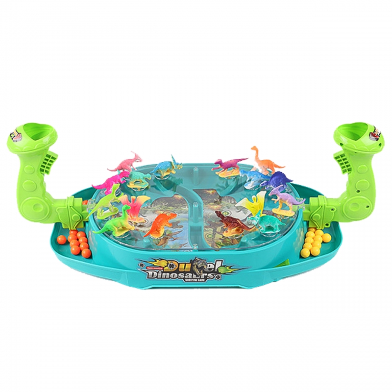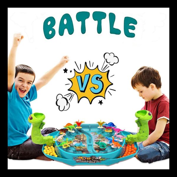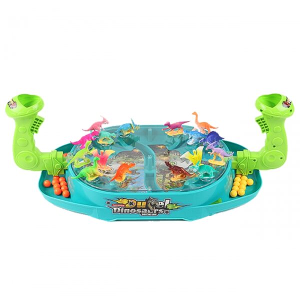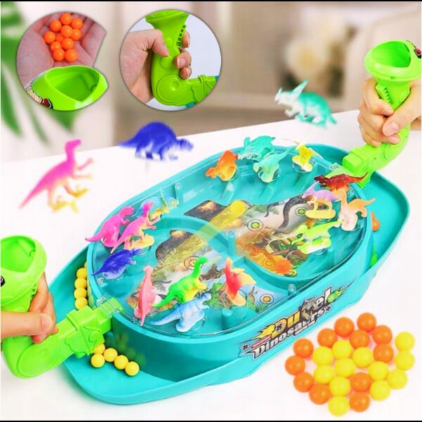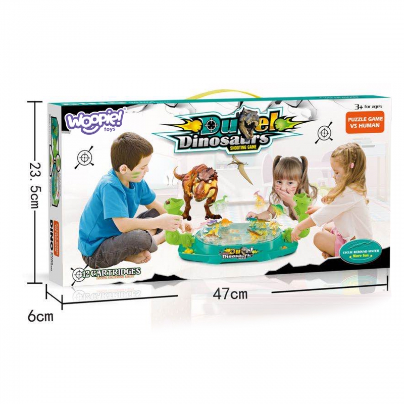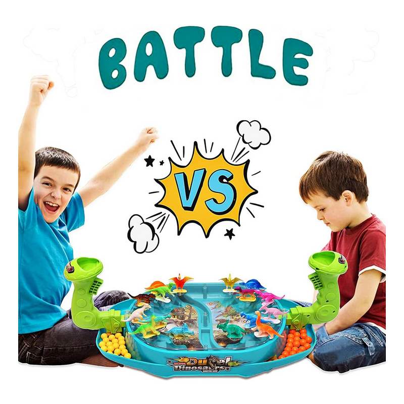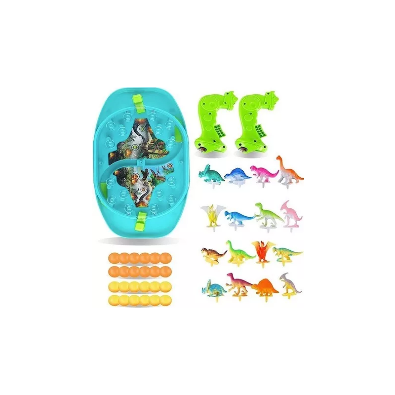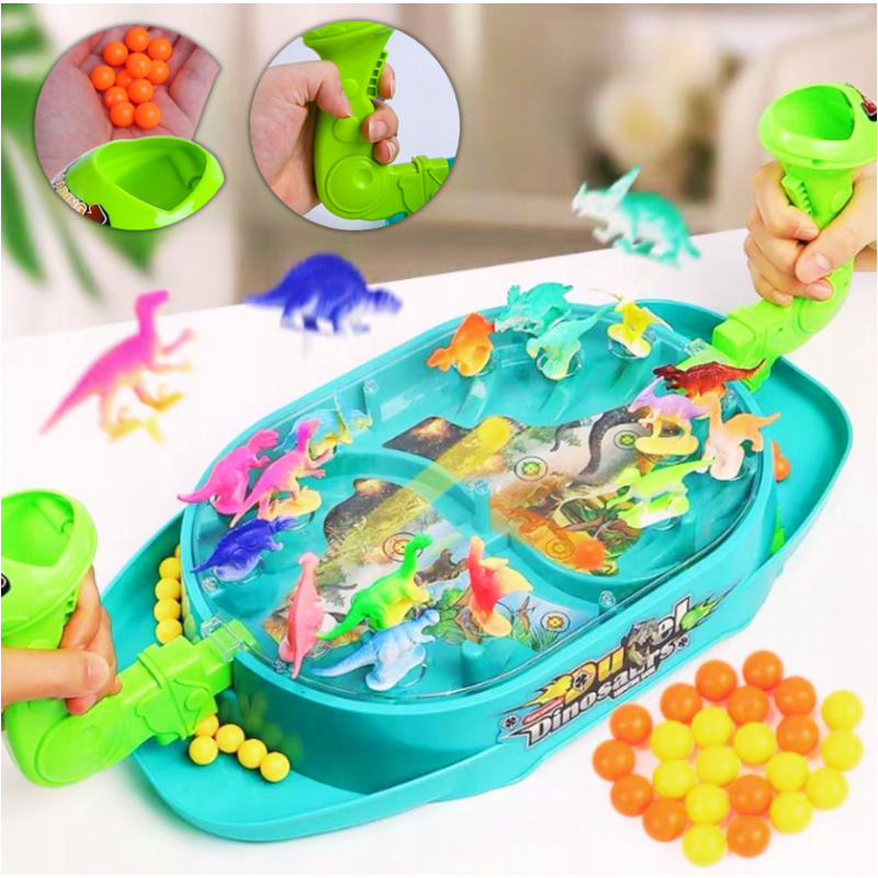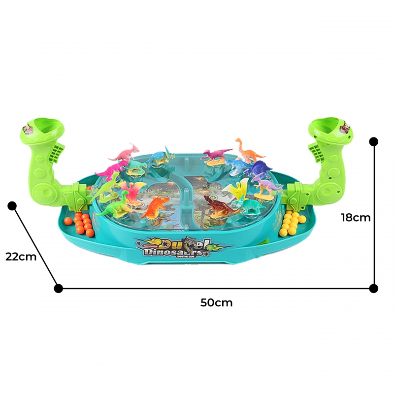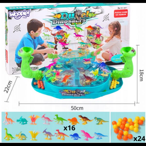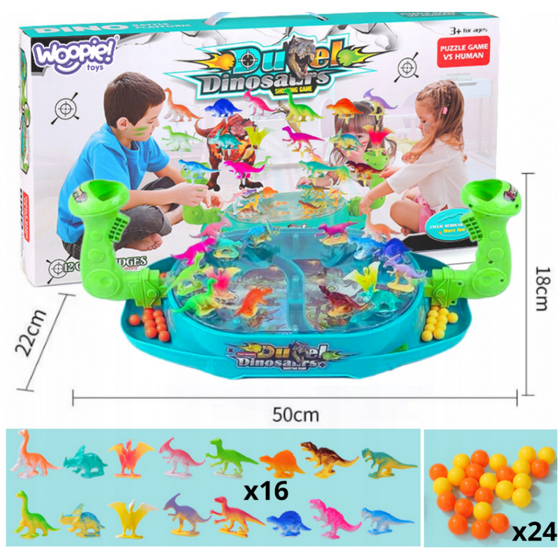 Bitwa Dinozaurów to gra zręcznościowa od marki Woopie. Ta dwuosobowa strzelanka w dinozaury znacznie poprawi zdolności koordynacyjne. Rozłóż dinozaury na planszy w odpowiednich miejscach. Wrzuć kulki do uchwytu i pociągnij za spust aby zbić dinozaury. Wygrywa gracz, który szybciej zbije kulkami dinozaury z planszy przeciwnika. Zestaw zawiera planszę do gry w plastikowa osłoną, która uniemożliwia wypadanie kulek za zewnątrz, 16 szt. kolorowych dinozaurów oraz 24 szt. kulek w dwóch kolorach.
